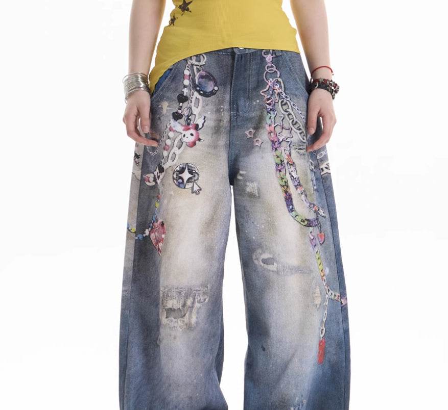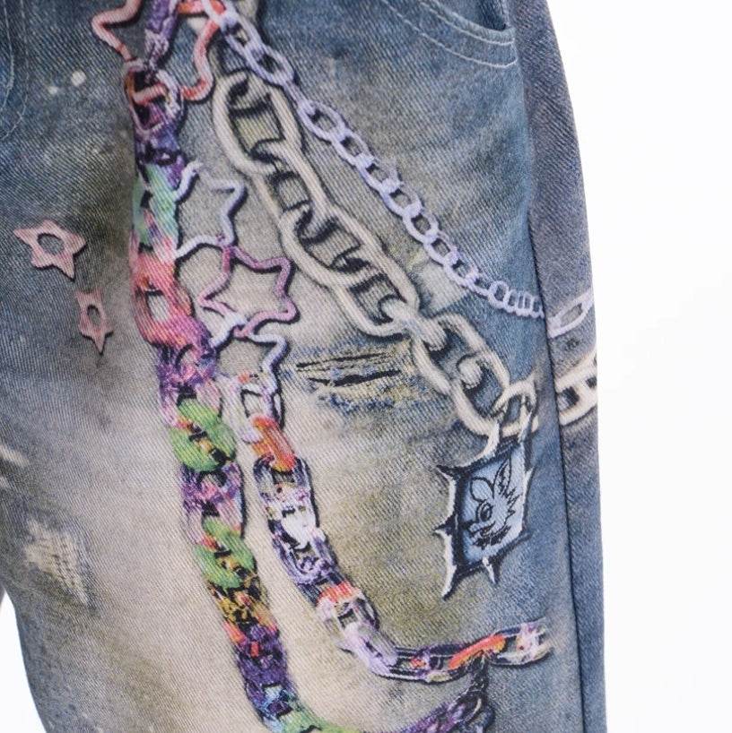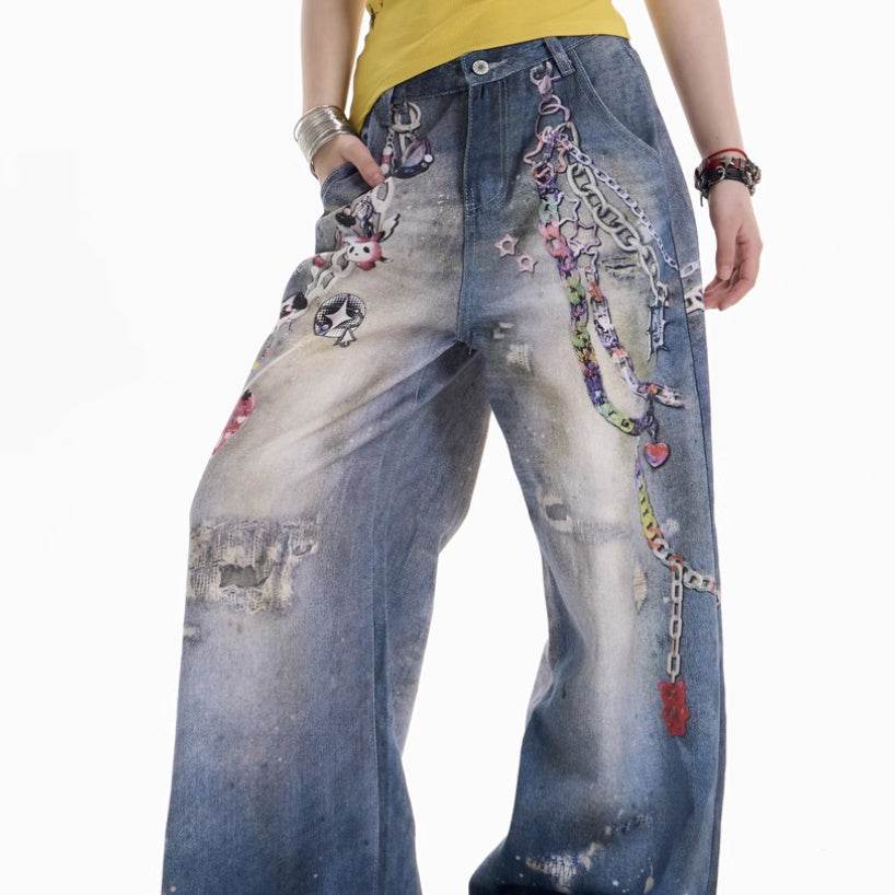 These American retro jeans for women feature a playful cartoon chain print that adds a unique, artistic touch to classic denim. Designed for comfort and style, they offer a flattering fit that complements casual and trendy outfits alike. Perfect for those who want to express individuality through bold, creative fashion. Curated by MuddyStock for women who appreciate distinctive and stylish denim.