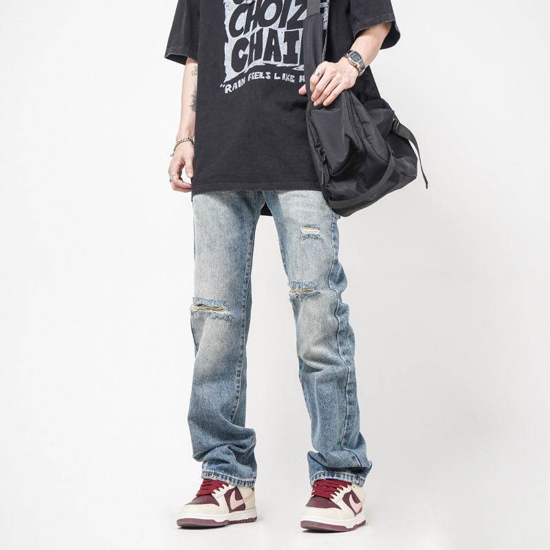 These American-style loose ripped jeans offer a perfect blend of comfort and edgy fashion for both men and women. Crafted with a relaxed fit, they provide ease of movement while the distressed details add a bold, contemporary touch to your wardrobe. Ideal for casual outings or streetwear looks, these jeans combine durability with style effortlessly. Handpicked by MuddyStock for those who appreciate authentic, trend-forward denim.