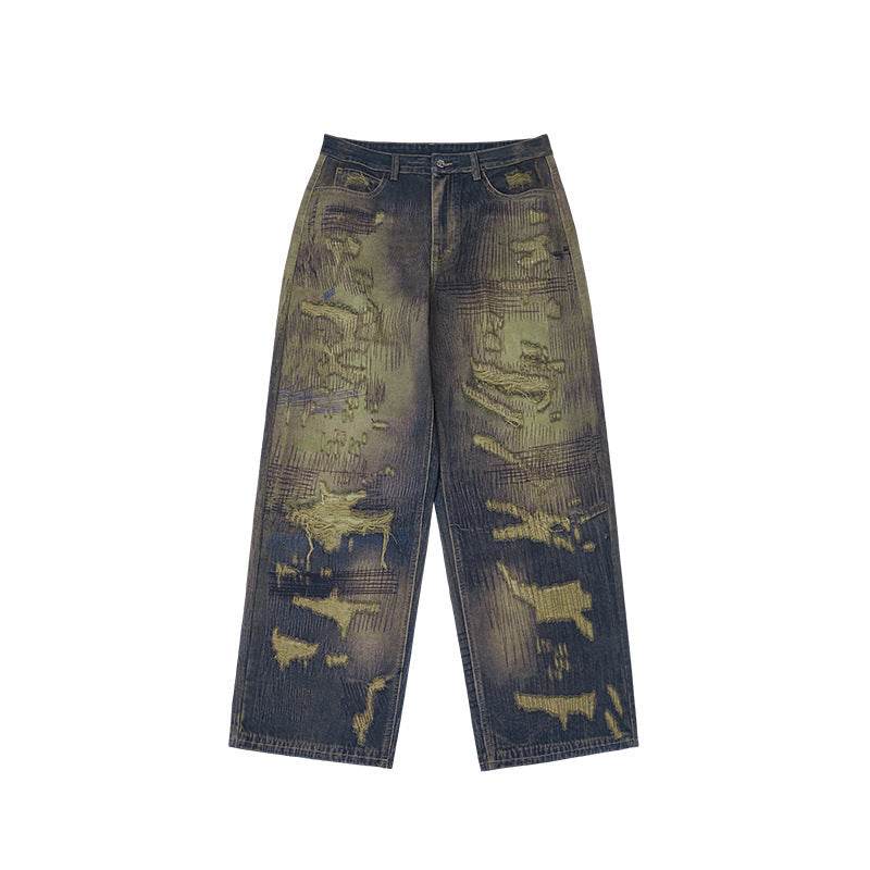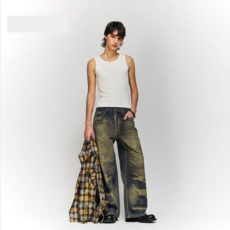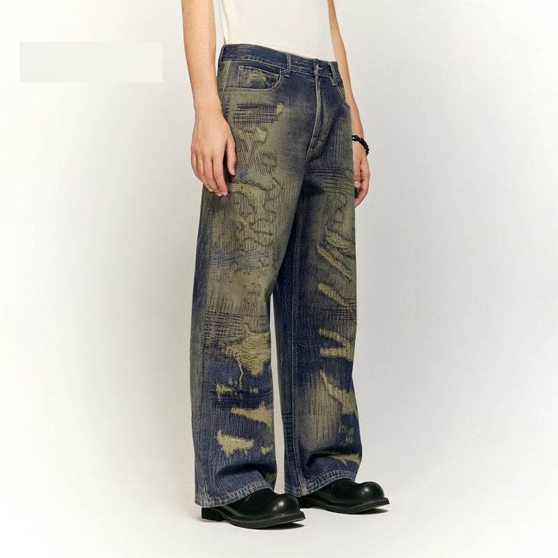 Autumn And Winter New American Street Fashion Printed Denim Wide Leg Pants For Men