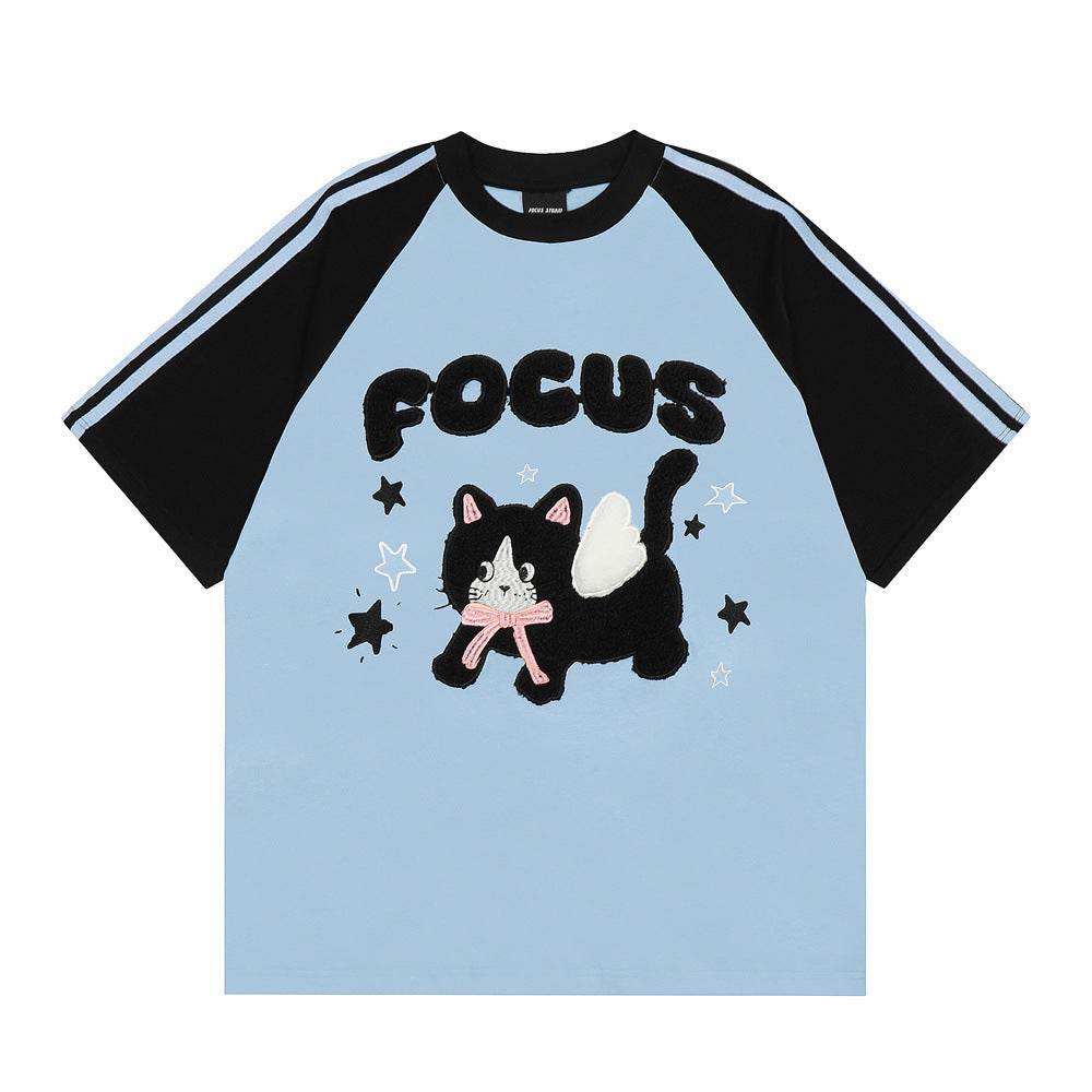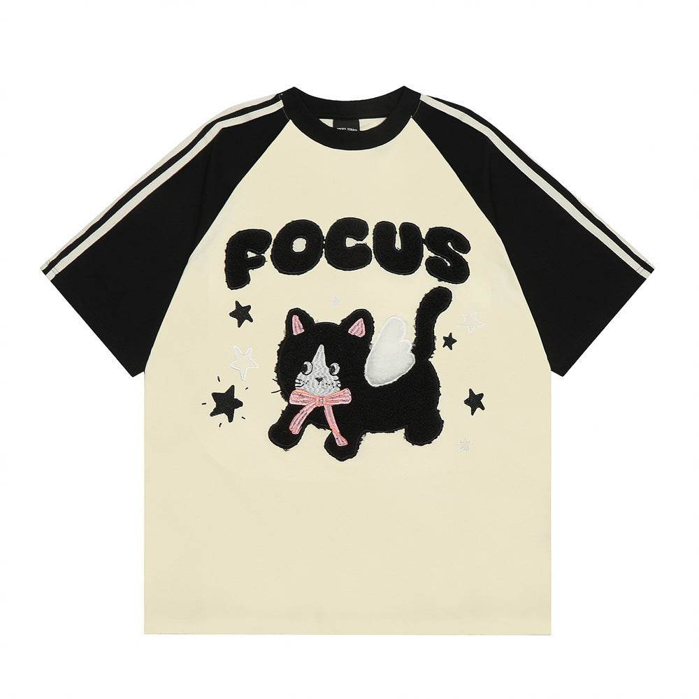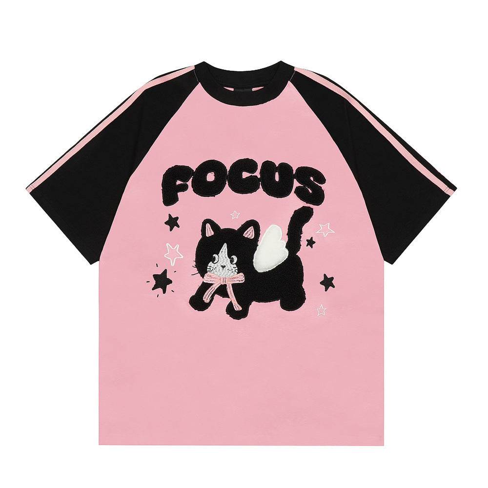 Cartoon Kitten Flocking Embroidered Short Sleeve For Men And Women