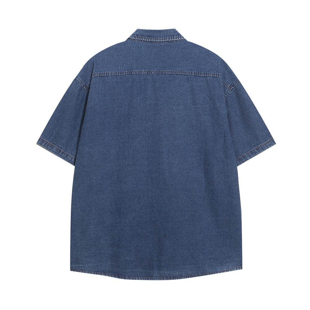 Embroidered Cat Denim Short Sleeve Shirt For Men And Women