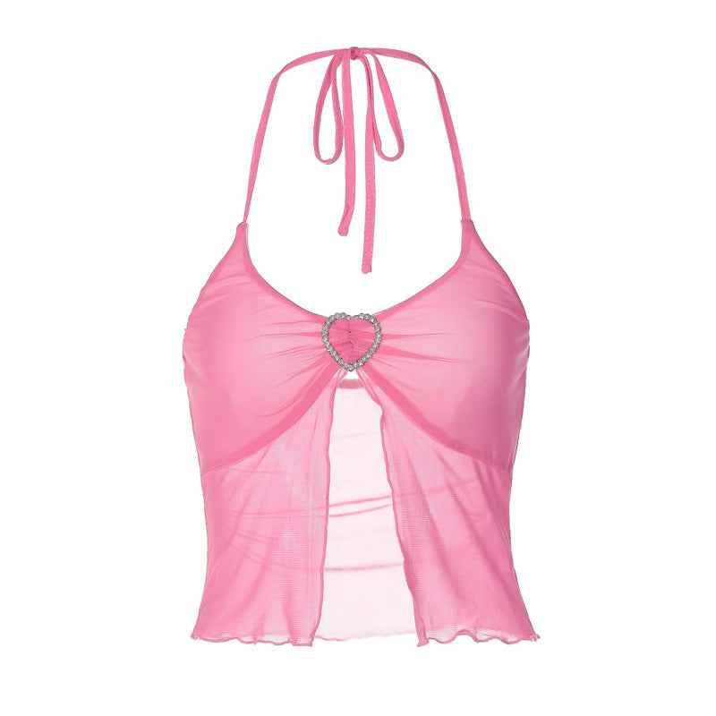Pink Mesh Stitching Chest-wrapped Halter Vest For Women