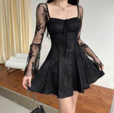 Lace Square Collar Dress Bell-bottom Long Sleeve Women Top